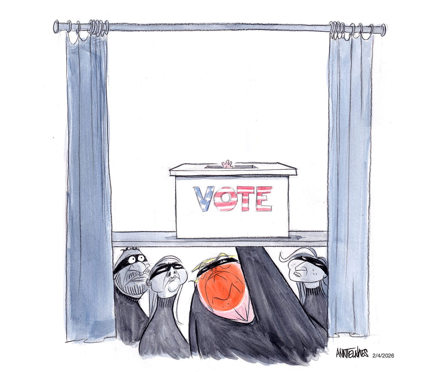 Criminal masksTrump and his cronies are laying the groundwork to fix the midtermsAnn TelnaesFeb 04, 202682365147ShareTrump openly calls for nationalizing voting.Open Windows- Ann Telnaes is a reader-supported publication. To receive new posts and support my work, consider becoming a free or paid subscriber.SubscribeOpen Windows- Ann Telnaes is a reader-supported publication. To receive new posts and support my work, consider becoming a free or paid subscriber.Subscribe